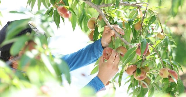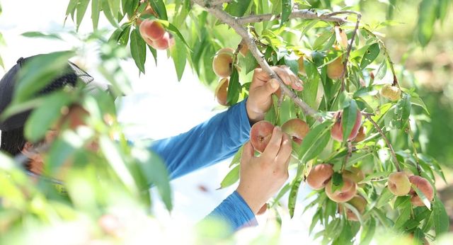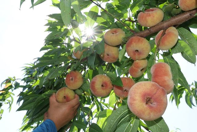 경북 의성군 금성면 제오리에서 농민이 납작 복숭아를 수확하고 있다. / 연합뉴스
