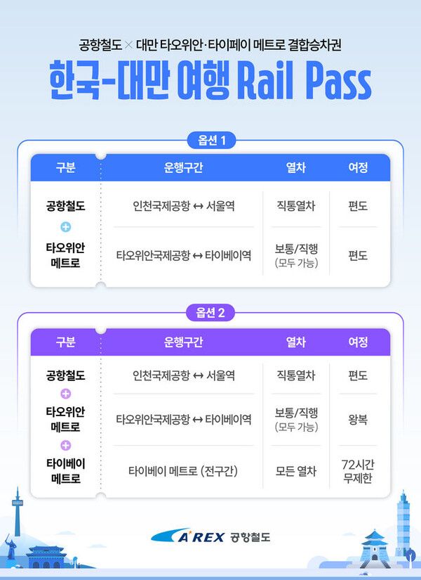 공항철도는 29일부터 대만 타오위안 메트로(Taoyuan Metro), 타이베이 메트로(Metro Taipei)와 양국 철도 이용을 한 번에 해결할 수 있는 ‘한국-대만 여행 레일 패스(Rail Pass)’를 출시한다고 밝혔다.
