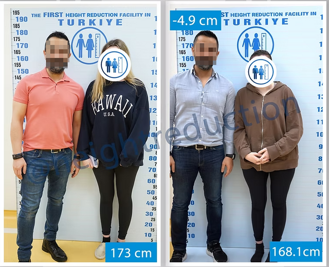터키 병원에서 실제 ‘키 축소 수술’을 받은 여성의 전후 사진. 왼쪽은 수술 전(173㎝), 오른쪽은 수술 후(168.1㎝) 모습으로, 함께 선 남성은 담당 의사다. [Height Reduction 공식 홈페이지]