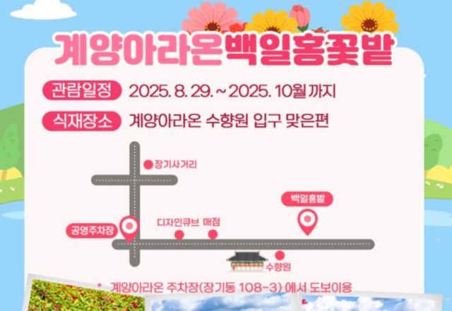 계양구는 이번 조성 과정에서 단순히 꽃을 감상하는 공간을 넘어 시민 누구나 머물며 여유를 즐길 수 있도록 꾸몄다. 백일홍밭 옆으로 잔디원 일부를 개방해 가족 단위 나들이객이나 연인들이 돗자리를 펴고 쉬어갈 수 있도록 했으며 사진 촬영 명소로도 손색이 없다. 꽃길을 따라 걷다 보면 도심 속에서도 한적한 정취를 느낄 수 있어 주말 나들이지로 안성맞춤이다.