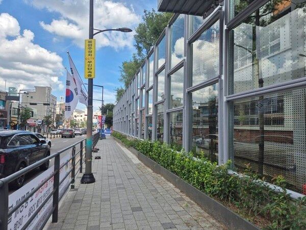 새롭게 설치된 방음벽은 투명 재질의 방음형 구조물로, 도심 경관을 해치지 않고 주변 환경과 자연스럽게 조화를 이루도록 설계했다. 투명 방음판은 조류 충돌 방지를 위한 도트 무늬를 전체적으로 적용했으며, 하부에는 촘촘한 간격으로 도트 무늬를 적용해 학교 내부 프라이버시 보호까지 동시에 고려했다.
