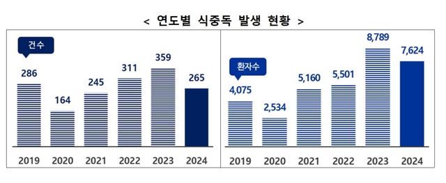 식품의약품안전처는 지난해 식중독 발생 현황을 분석한 결과를 29일 발표했다. 식약처에 따르면 2024년 한 해 동안 발생한 식중독은 총 265건으로 집계됐고 환자 수는 7624명에 달했다. 전년과 비교해 건수는 26%, 환자 수는 13% 줄어든 수치다.