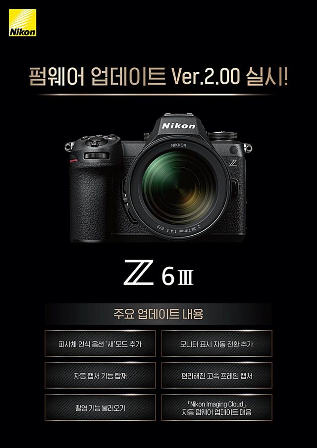 니콘이미징코리아가 풀프레임 미러리스 카메라 Z6III 전용 펌웨어 2.00 버전을 27일 공개했다. 발매 이후 첫 대규모 업그레이드로, 플래그십 모델 Z9과 Z8에 적용된 여러 기능이 새롭게 추가됐다.