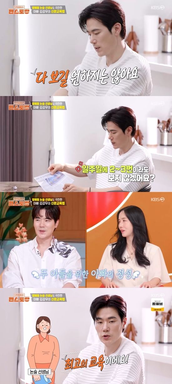 김강우는 "어린이 신문을 같이 시켰다. 제가 어렸을 때는 학교에서 매일 봤다"라고 밝혔다. 또 "다 보길 원하지는 않는다. 이렇게 던져놓으면 일주일에 2~3번은 볼 거다. 절대 억지로 강요하지 않는다. 화장실에도 붙여놓는다. 안 봐도 되지만 보게 된다. 그리고 저랑 얘기를 나눈다"라며 비결을 공개했다.