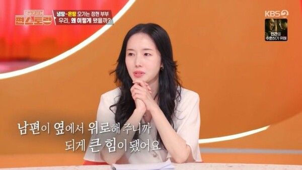 이정현은 "결혼하고 가장 좋았던 것이 있다. 가장 힘들 때 남편이 옆에서 위로해 주니까 큰 힘이 됐다"며 "엄마가 돌아가시기 전에 엄마와 매주 여행을 갔다. 남편도 휴가를 내고 같이 다녔다. 그때 엄마가 못 걸으시니까 남편이 업고 다녔다. 정말 고마웠다"고 눈물을 보였다.
