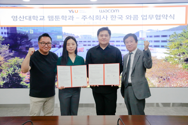 영산대학교 웹툰학과가 세계적인 태블릿 기업 ‘한국와콤’과 손잡고 차세대 웹툰 창작 인재 육성에 나선다. 영산대는 한국와콤과 함께 28일 해운대캠퍼스에서 디지털 창작 인재를 체계적으로 양성하고 최첨단 교육 환경을 구축하는 협약(MOU)을 체결했다고 29일 밝혔다.