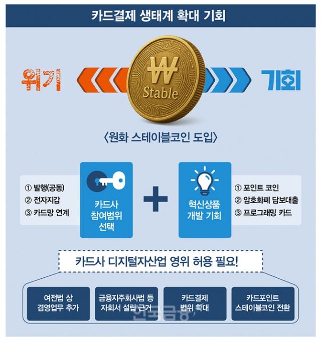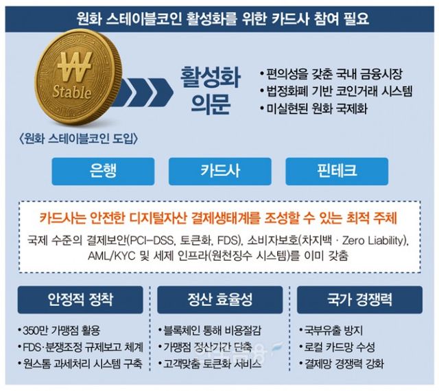 카드사들은 350만 가맹점과 전 국민 회원 네트워크라는 견고한 기반이 있다. 스테이블 코인이 유통되려면 가맹점을 확보해야 한다. 직불 결제가 스테이블코인으로 대체되더라도 이를 관리·운영할 주체는 이미 회원사인 가맹점을 관리해온 카드 업계가 될 공산이 크다.