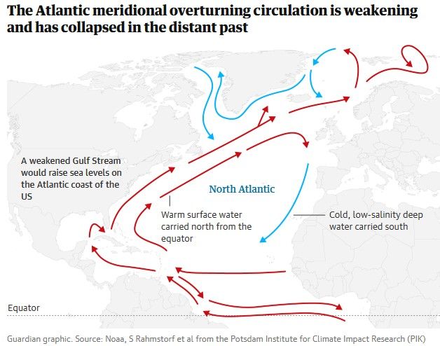 기후 위기로 북극 기온이 급등하면서 바다가 식는 속도가 늦어지고, 밀도가 낮은 따뜻한 물이 깊이 가라앉지 못한 채 피드백 루프를 형성하는 점도 붕괴를 가속화하는 요인으로 지목된다. 일부 과학자들은 “향후 수십 년 안에 AMOC가 급격히 느려지고 금세기 중반 이후에는 완전히 멈출 수 있다”고 내다보며 위험성은 과소평가할 수 없다고 지적했다.