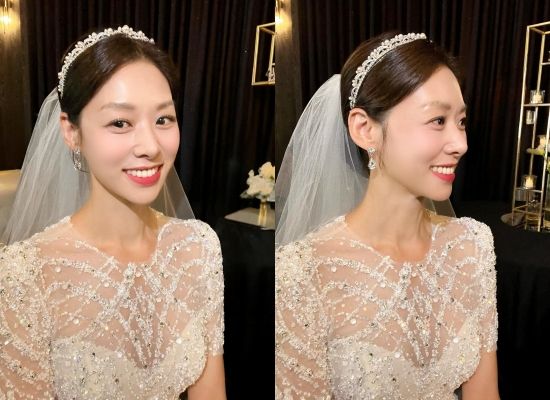 사진 속 장신영은 화려한 비즈 장식이 돋보이는 드레스를 입고 단아한 티아라와 베일을 착용해 고혹적인 신부 자태를 뽐냈다.
