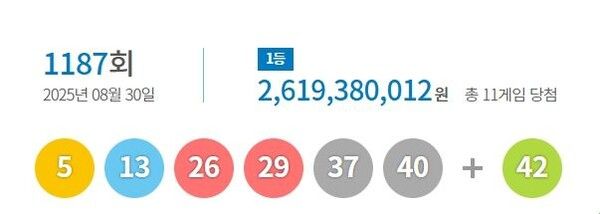 30일 제1187회 동행복권 로또 추첨 결과 '5, 13, 26, 29, 37, 40'이 1등 당첨 번호로 결정됐다. 2등 보너스 번호는 '42'이다.