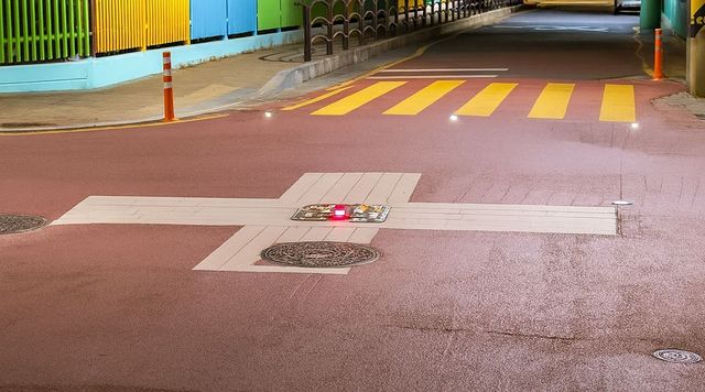 교차로 바닥에 설치된 노면 신호등은 차량 중심의 교통 흐름과 안전을 관리하기 위해 설계된 첨단 교통 신호 장치로, 횡단보도 주변의 보행자 중심 노면 신호등과 구별된다.