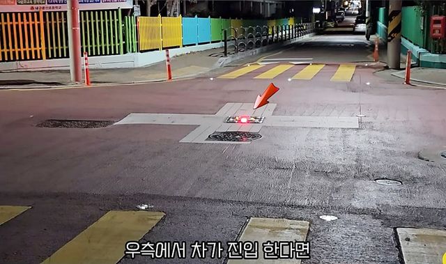 교차로 바닥에 있는 노면 신호등 모습.운전자는 해당 노면 신호등을 준수하기 위해 몇 가지를 유의해야 합니다. 노란색 깜빡임 시에는 반대 방향 차량, 보행자, 자전거를 확인하며 신중히 통과해야 한다. 빨간색 깜빡임 시에는 정지해 충돌을 피해야 합니다. 해당 노면 신호등은 교차로에서 모두의 안전을 보장하는 중요한 역할을 합니다. / 유튜브 '차개미'