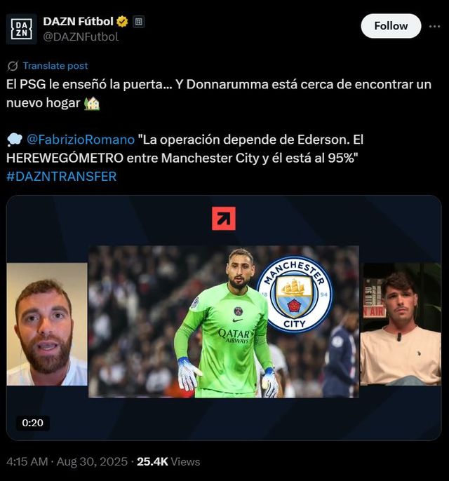 글로벌 스포츠 매체 'DAZN'은 30일(한국시간) 공식 사회관계망서비스(SNS)를 통해 유럽 이적시장 전문가 파브리치오 로마노와의 인터뷰 발언을 인용 "PSG는 돈나룸마에게 출구를 제시했다. 그는 새로운 보금자리를 찾고 있으며, 맨체스터 시티행 가능성이 95%에 도달했다"고 보도했다.