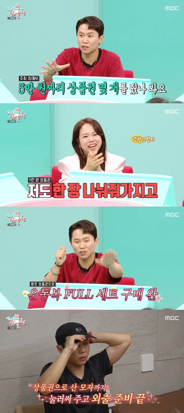 양세형은 "저 운동복은 개그맨 후배가 달리기 관련된 콘텐츠를 하는데 상품권 5만원짜리를 몇 장 줬나보다. 그래서 저도 한 장 줘서 그걸로 티셔츠 하나 살 때 이것저것 샀다"라며 상품권으로 구매한 것이라고 이야기했다. 이에 전현무는 "진짜 알뜰하다"라며 감탄했다.