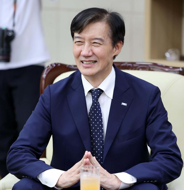 조국 조국혁신당 혁신정책연구원장이 28일 전북 익산시 원불교 중앙총부를 방문해 나상호 원불교 교정원장을 만나 대화를 나누고 있다. / ㅠ스1