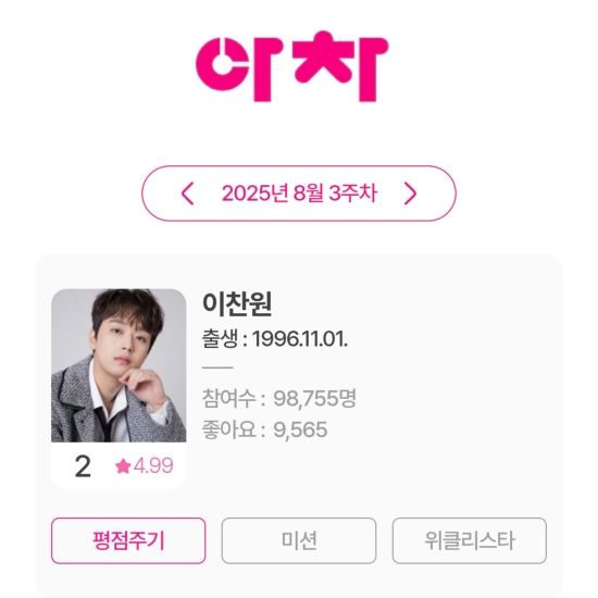 최근 아이돌차트에 따르면, 이찬원은 8월 3주 차 평점랭킹에서 2위를 기록했다.