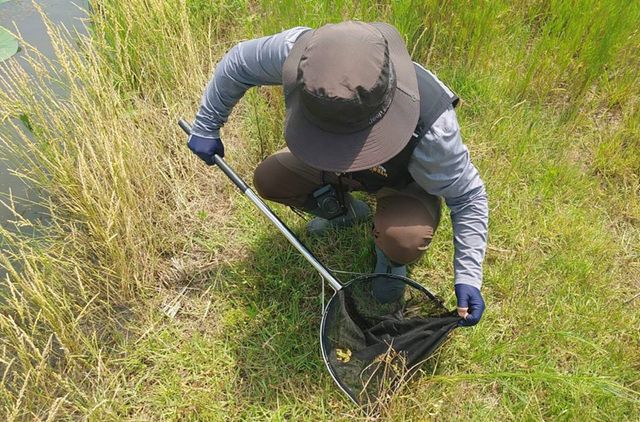 멸종위기종 금개구리 이주를 위한 포획 장면.한국농어촌공사는 새만금 국가산업단지 개발 과정에서 대체 서식지로 이주한 멸종위기 야생생물 2종에 대해 현장 점검을 시행한다고 최근 밝혔다. / 한국농어촌공사 제공