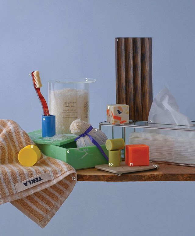 1 비누나 방향제를 올려둘 수 있는 참나무 소재 우드 트레이는 6만9천원 Blomus. 2 쑥, 로즈메리, 유칼립투스 향이 나는 배스 솔트는 6만8천원 Tea Collective. 3 이탈리아 장인이 제작한 솔이 긴 형태의 칫솔은 3만6천원 Koh I Noor. 4 묵직한 도자 소재의 칫솔 홀더는 2만1천원 Hay by Rooming. 5, 8, 10, 11 자투리 비누를 모아 얼굴과 몸에 모두 사용할 수 있도록 만든 리사이클링 비누는 4개 세트 2만6천원 Hanahzo. 6 유리 소재의 다용도 티슈 박스는 9만9천원 Zarahome. 7 라벤더와 네롤리, 캐모마일 향을 내는 배스 밤은 2만원 Lush. 9 뚜껑이 있는 가벼운 레진 소재의 수납 박스는 8만7천원 Ferm Living by Rooming. 12 일반 수건보다 작아 핸드 타월로 활용하기 좋은 게스트 타월은 4만원 Tekla. 13 일본의 미니멀리즘에서 영감받은 도자 소재의 솝 트레이는 2만8천원 Ferm Living by Rooming.