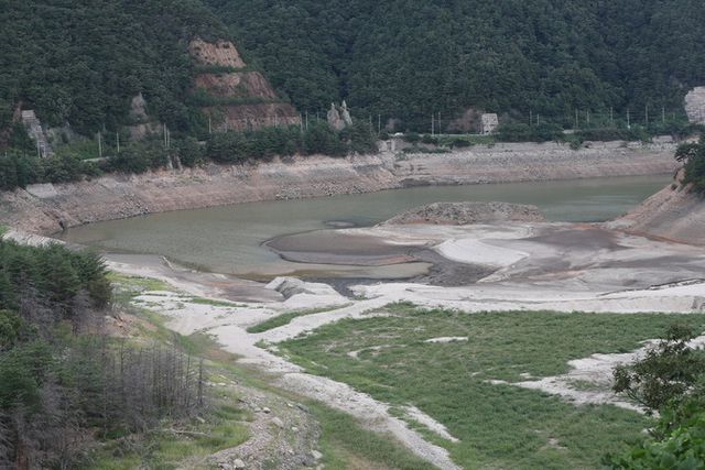 지난 29일 상수원 강릉 오봉저수지가 바짝 말라 있는 모습. ⓒ 연합뉴스