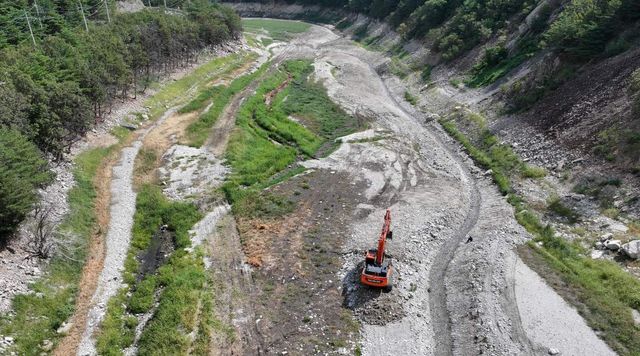 강릉시 주요 상수원인 오봉저수지 상류에서 한 관계자가 포크레인으로 물길을 내고 있다. / 뉴스1