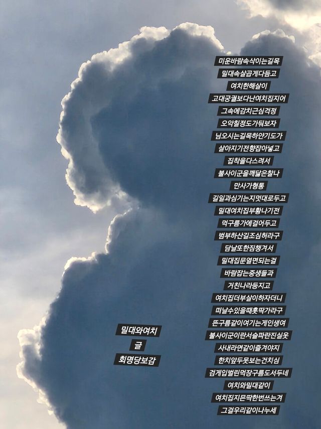 미운바람속삭이는길목 밀대속살곱게다듬고 여치한해살이 고대궁궐보다난여치집지어 그속에감치근심걱정 오악칠정도가둬보자 님오시는길목하얀기도가 살아지기전향잡아넣고 집착을다스려서 불사이군을깨닳은찰나 만사가형통 길일과심기는지멋대로두고 밀대여치집부황나기전 먹구름가에걸어두고 범부하산길조심허라구 담날또한짐챙겨서 밀대집문열면되는걸 바람잡는중생들과 거친나라등지고 여치집더부살이하자더니 떠날수있을때훗딱가라구 뜬구름같이여기는게인생여 불사이군이란서슬파란진실옷 사내라면같이즐겨야지 한치앞두못보는건치심 검게입벌린먹장구름도서두네 여치와밀대같이 여치집지믄딱한번쓰는겨 그걸우리같이나누세