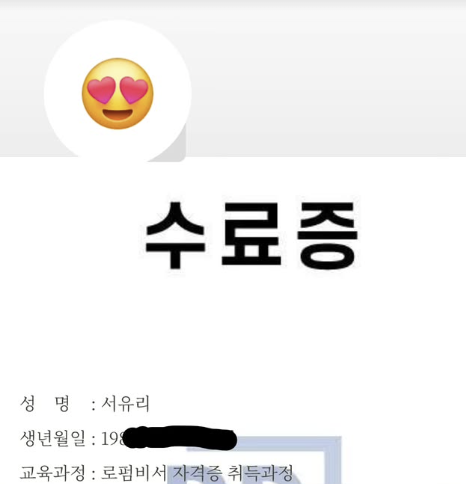 함께 공개한 사진에는 생년월일을 가린 서유리의 수료증이 담겨있다. 앞서 서유리는 결혼정보회사를 통해 법조계에 종사하고 있는 연하의 남자친구를 만났다고 밝힌 바 있다.