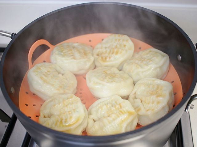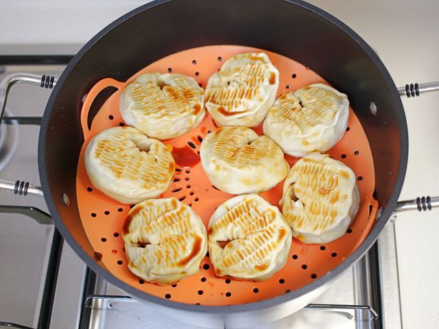 냉동만두를 찌는 동안 생긴 수분이 아래로 흐르기 때문에