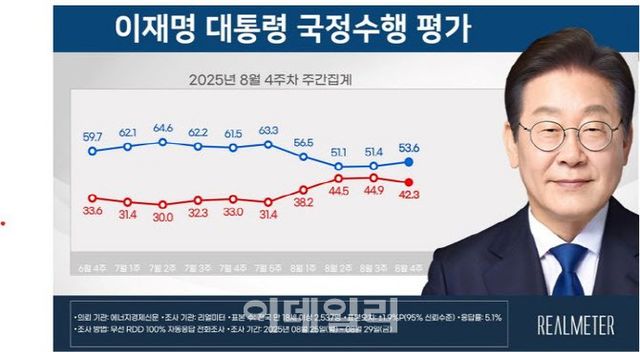 여론조사 전문기관 리얼미터가 에너지경제신문 의뢰로 실시한 8월 4주차 주간 집계에 따르면, 이 대통령의 국정수행 긍정 평가는 53.6%(‘매우 잘함’ 43.9%·‘잘하는 편’ 9.7%)로 전주 대비 2.2%p 올랐다. 부정 평가는 42.3%(‘매우 잘못함’ 32.6%·‘잘못하는 편’ 9.7%)로 2.6%p 하락했다. 긍·부정 격차는 오차범위를 벗어난 11.3%p였다. ‘잘 모름’ 응답은 4.1%였다.