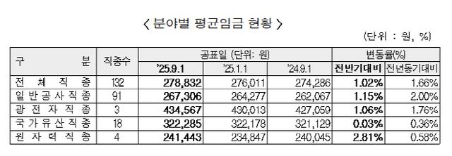 광전자 직종(3개)은 43만 4567원으로 전년동기대비 1.8%, 국가유산 직종(18개)은 32만 2285원으로 전년동기대비 0.4% 올랐다. 원자력 직종 4개는 24만 1443원으로 전년동기대비 0.6% 올랐다.
