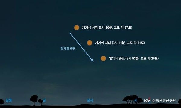 개기월식은 지구 반그림자에 달이 들어가는 반영식을 시작으로, 달이 지구 본그림자에 일부분 가려지는 부분식이 8일 새벽 1시 26분 48초에 시작된다.