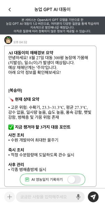 사용자는 커넥트 앱에서 실시간으로 재해 정보를 확인하고 'AI 대동이'로부터 사전·즉시·사후 단계별 맞춤 농작업 지침을 받아 작물 생육 상태를 더욱 효과적으로 관리할 수 있다.