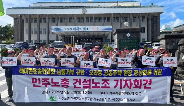 [한라일보] 제주지역 건설 노동자들이 2주일째 멈춰 있는 오등봉 공원 건설현장 정상화를 촉구하며 전국레미콘운송연합회를 규탄하고 나섰다.