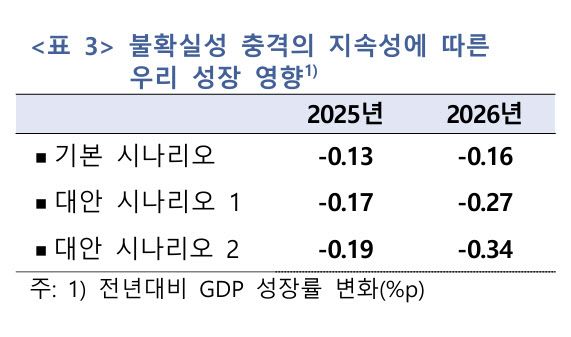 더 나아가 높은 관세 불확실성이 트럼프 2기 내내(2028년까지) 지속될 경우에는 올해는 0.19%, 내년에는 0.34% 하락이 예상됐다.