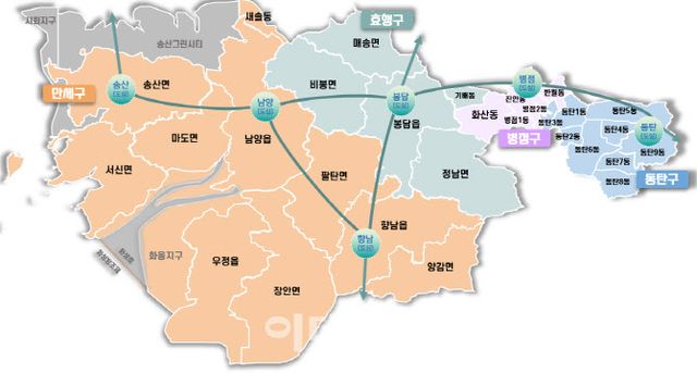 내년 2월 신설되는 화성시 4개 일반구의 관할 행정구역은 △만세구-우정·향남·남양읍, 마도·송산·서신·팔탄·장안·양감면·새솔동 △효행구-비봉·매송·정남면, 기배동 △병점구-진안·병점1·병점2·반월·화산동 △동탄구-동탄1~9동이다.