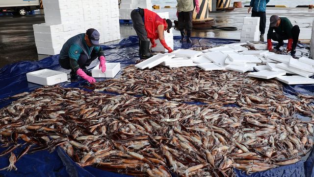 어민들이 채낚기 어선이 잡아 온 오징어를 선별해 상자에 담고 있는 모습 / 연합뉴스