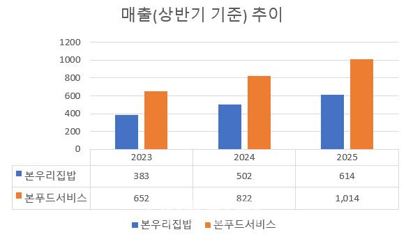 본우리집밥의 가파른 성장세에 힘입어 본푸드서비스도 계속 체급을 키우고 있다. 본푸드서비스는 급식사업을 바탕으로 식자재 유통과 컨세션사업(식음료위탁서비스)으로 영역을 확장하고 있다. 본푸드서비스의 상반기 매출은 1014억원으로 전년동기 대비 24% 커졌다.