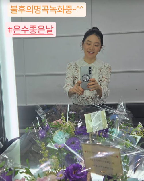 또한 이영애는 '불후의 명곡' 제작진 일동이 준비한 거대한 꽃바구니를 인증하며 행복하게 미소 짓고 있다.