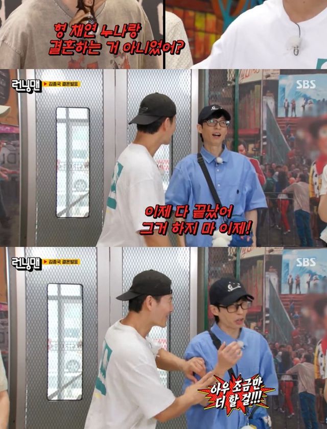 김종국의 열애 의혹을 꾸준히 제기했던 하하는 "채연 누나랑 결혼한 거 아니었냐"고 놀리는 하하에 "이제 다 끝났다. 그거 하지 마"라고 경고했다. 이에 유재석 또한 "조금만 더 할 걸"이라며 후회를 표해 웃음을 안겼다.