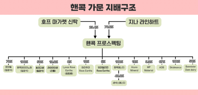 지나의 올해 나이는 68세다. '핸콕 프로스펙팅'은 지나가 전체 지분의 76.6%를, 나머지는 자녀들이 운영권을 가지고 있는 가족신탁사(호프 마가렛)가 각각 가지고 있다. 핸콕 프로스펙팅은 현재 △로이힐(연간 6000만톤) △호프다운스(연간 4000만톤) △핸콕 아이언 오레(연간 7400만톤) 등의 철광석 광산 계열사를 소유하고 있다. 이 중 로이힐의 경우 국내 기업인 포스코가 일부 지분을 소유하고 있지만 지배력을 행사할 정도의 수준은 아니다. 또 △이삭플레인(석탄) △라이언 타운(리튬) △아라푸라(희토류) △브라질리언 레어 어스(희토류) △라이너스 어스(희토류) 등 다양한 광물을 생산하는 계열사도 지배하고 있다.