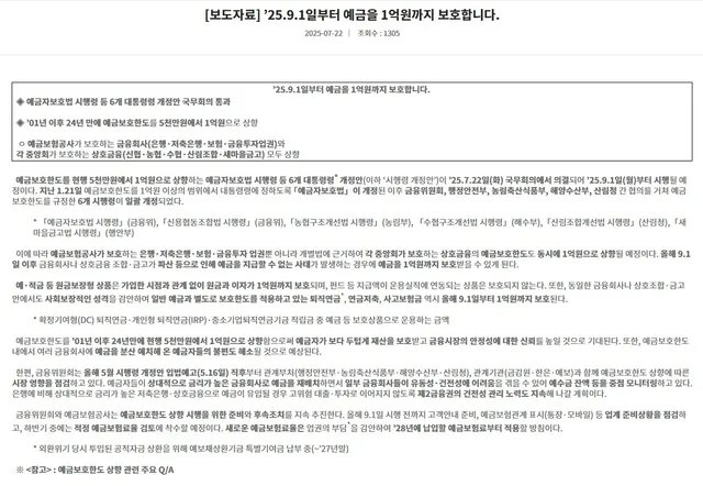 1. 기존 예적금 보호 5천만원 → 1억원으로 상향