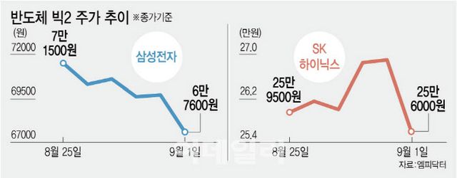 1일 엠피닥터에 따르면 이날 삼성전자는 전 거래일 대비 2.87% 내린 6만 7700원에, SK하이닉스는 같은 기간 4.83% 내린 25만 6000원에 거래를 마쳤다.