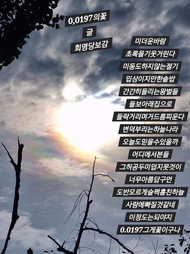 초록을기웃거린다 미동도하지않는절기 밉상이지만한솥밥 간간히들리는왕벌들 들보아래집으로 들락거리며거드름피운다 변덕부리는하늘나라 오늘도믿을수있을까 어디에서본들 그허공두미덥지못것이 너무아름답구먼 도반모르게슬쩍훔친하늘 사랑에빠질것같네