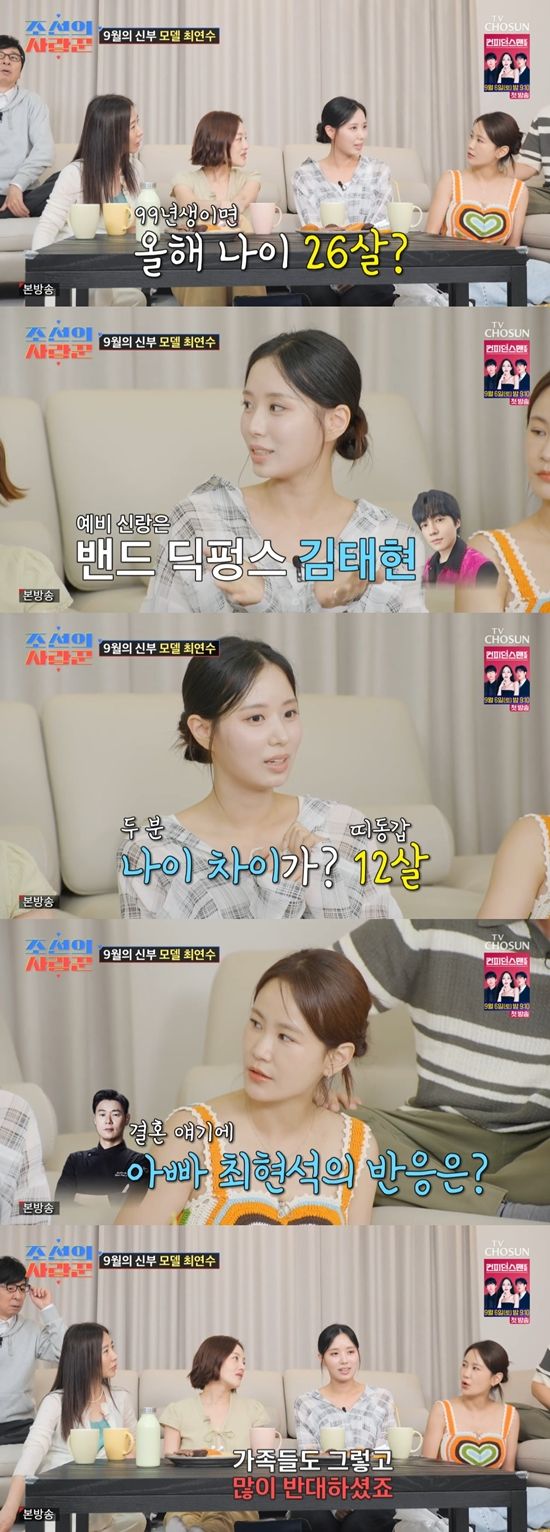 김지민은 "결혼한다고 했을 때 이른 나이면 아빠들은 빨리 보내기 싫어하지 않냐?"라며 최현석 셰프의 반응을 물었다. 최연수는 "아무래도 가족들이 많이 반대했다. 남자친구의 좋은 점을 계속 보여주고, 남자친구도 노력을 많이 해서 (허락을 받았다). (아빠가) '보니까 또 착하고, 성격도 괜찮네'라고 했다"라고 답했다.