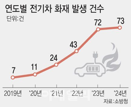 전기차 보급에 속도가 붙으면서 전기차 화재도 매년 늘었다. 소방청은 2019년 7건이던 전기차 화재가 지난해 73건으로 5년 만에 10배 이상 증가했다고 밝혔다. 이 기간에 발생한 인명피해는 총 19명(사망자 3명, 부상자 16명), 재산피해는 94억 5161만 6000원으로 집계됐다.
