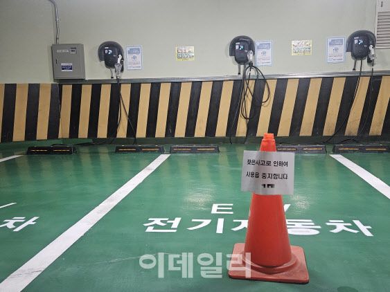 1일 이데일리가 찾은 서울 영등포구의 한 빌딩 지하주차장. 이곳 구석에 마련된 전기차 충전구역에는 전기차 대신 ‘잦은 사고로 인해 사용을 중지한다’는 안내문이 붙어 있었다. 차량이 빽빽이 들어선 출근시간대에도 전기차량용 주차공간은 텅 비어 있었다. 주차장 기둥에는 전기차 충전구역이나 주변에 물건을 적재하거나 일반차량을 주차할 경우 충전 방해로 과태료 10만원을 부과한다는 구청 안내문이 부착돼 있었다. 이를 두고 관리사무소 관계자는 “작년에 인천 화재 후 위험하니까 이렇게 해둔 것이다”며 “불이 났을 때 우리가 끌 수 없으니까 주차를 못 하게 하는 수밖에 없다”고 말했다.