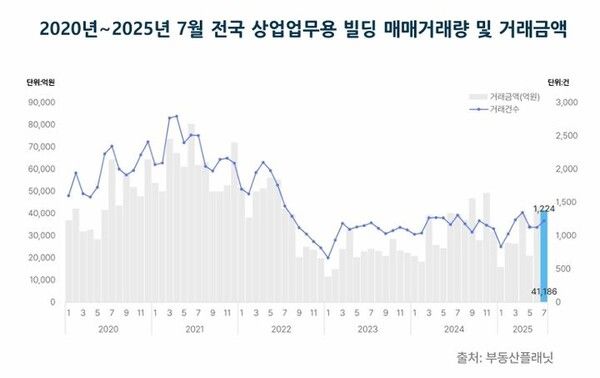뉴시스 보도에 따르면, 상업용 부동산 전문 프롭테크 기업 부동산플래닛은 2일 발표한 7월 전국 상업업무용 빌딩 거래 시장 분석을 통해 이같이 밝혔다.
