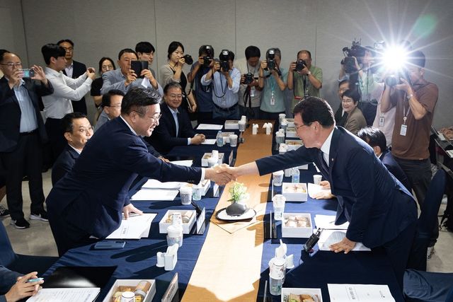 윤호중 행정안전부 장관과 신정훈 행정안전위원장이 2일 서울 여의도 국회에서 열린 행안위 당정협의에 앞서 악수하는 모습 / 뉴스1