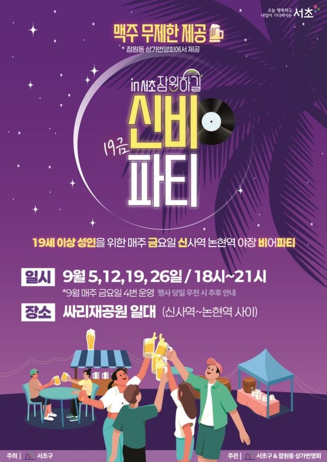 서울 서초구는 9월 매주 금요일, 잠원동 상권 ‘잠원하길’에서 ‘19금 신비파티(19세 이상 성인을 위한 신사역·논현역 비어파티)’를 개최한다고 2일 밝혔다.