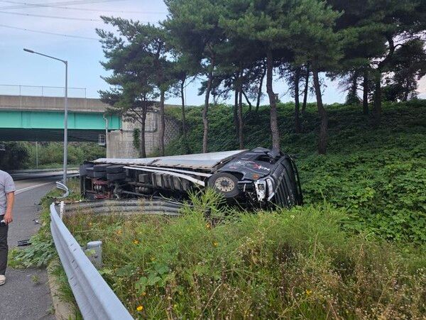2일 오전 5시55분께 부산울산고속도로 장안IC 램프 구간에서 화물차가 중앙 연석과 가드레일을 들이받고 옆으로 넘어졌다.
