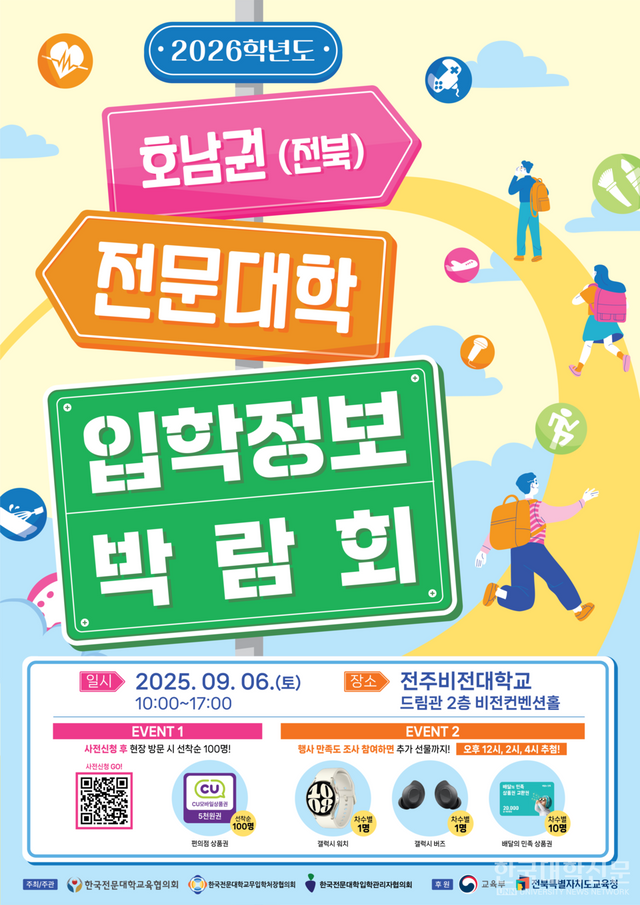 [한국대학신문 김영성 기자] 전주비전대학교(총장 우병훈)는 오는 6일(토) 오전 10시부터 오후 5시까지 드림관 2층 비전컨벤션홀에서 ‘2026학년도 호남권(전북) 전문대학 입학정보 박람회’를 개최한다고 밝혔다. 이번 박람회는 한국전문대학교육협의회, 한국전문대학교무입학처장협의회, 한국전문대학입학관리자협의회가 공동으로 주최·주관하며, 교육부와 전북특별자치도교육청이 후원한다.